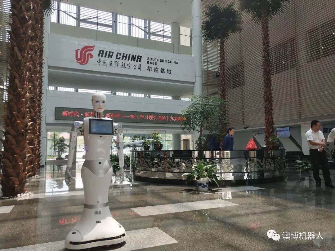 圖為澳博服務(wù)機(jī)器人小澳在白云機(jī)場(chǎng)國航大廈使用