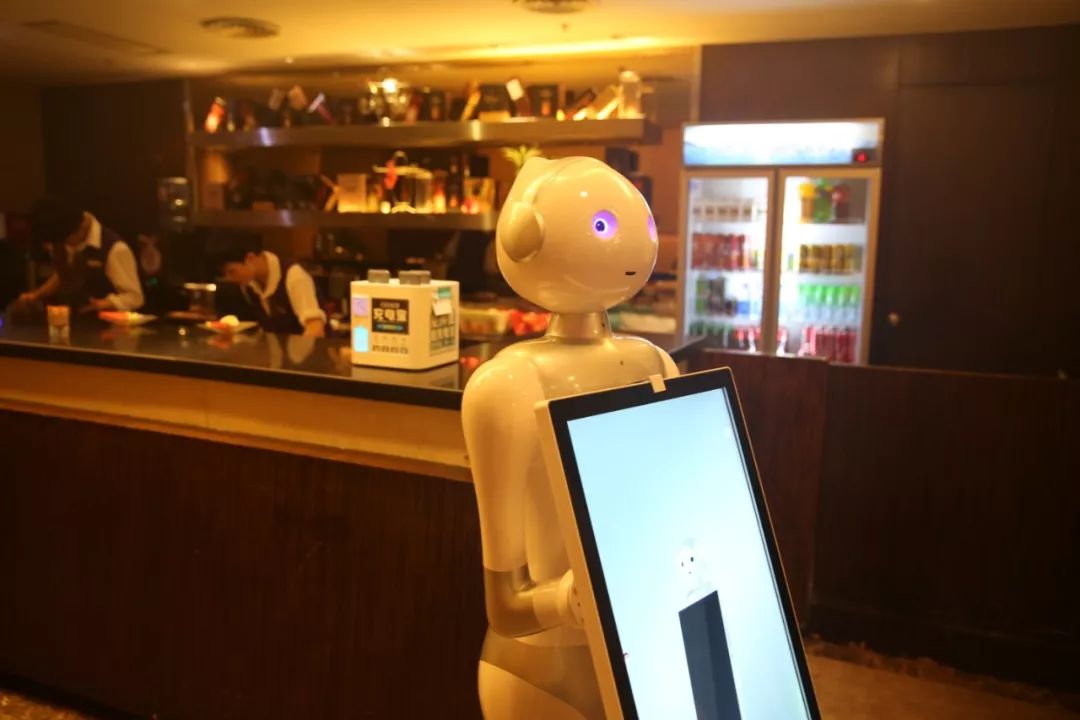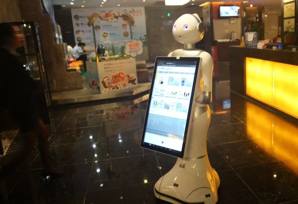 圖為澳博服務(wù)機器人蒜頭在前臺接待客戶