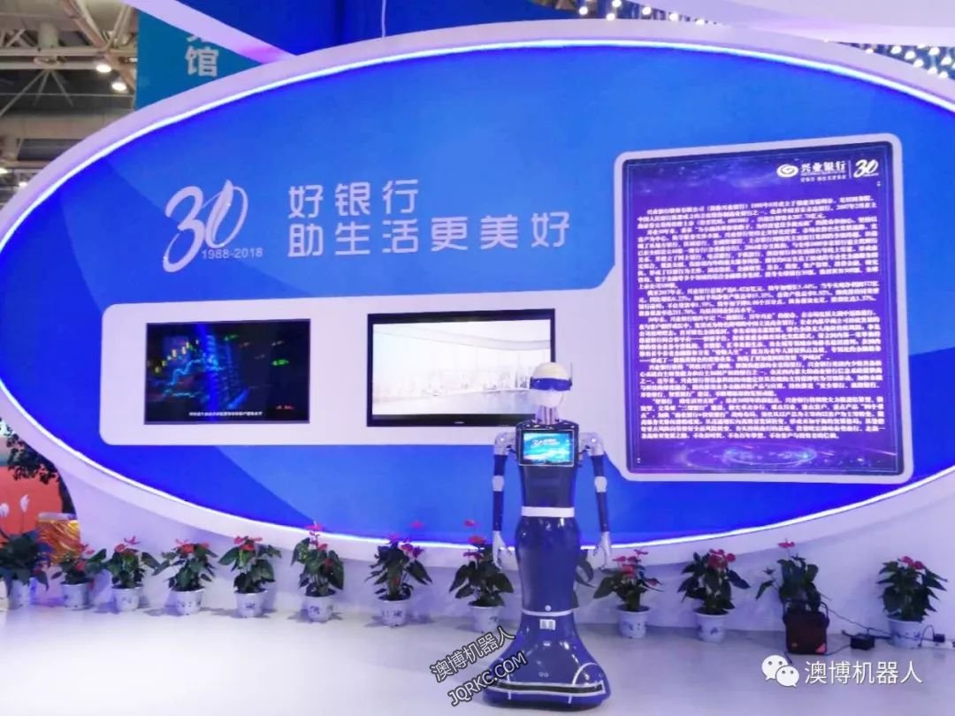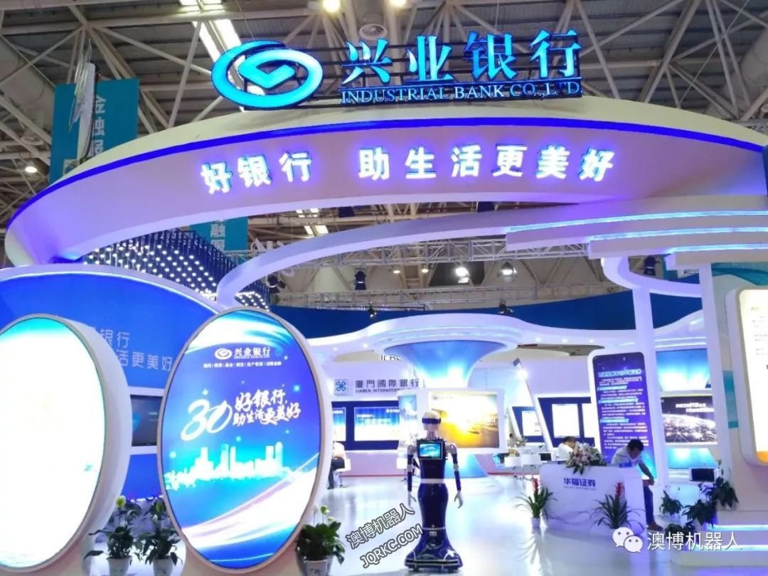 人型機器人藍(lán)豆在展會上,帶領(lǐng)參展觀眾全面了解興業(yè)銀行成立三十年的發(fā)展歷程,體驗該行全新的高科技金融服務(wù)產(chǎn)品、為在場的客人提供帶領(lǐng)引導(dǎo),金融知識講解服務(wù)。