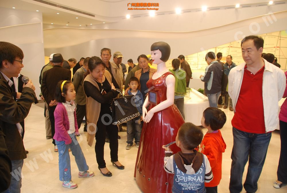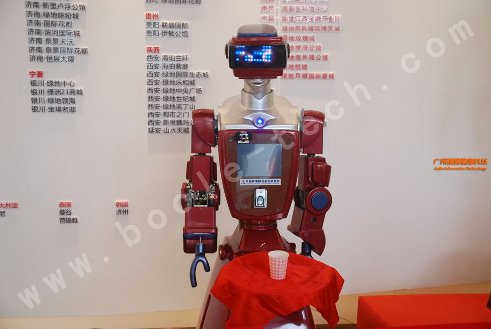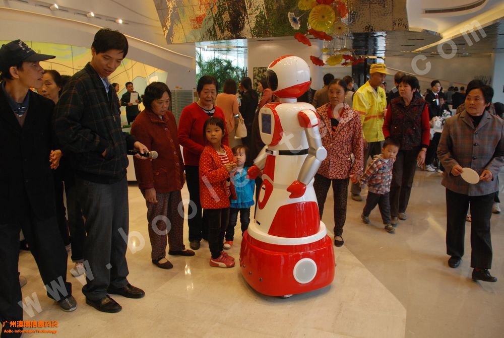 該機(jī)器人擁有基本的迎賓互動功能,能與游客打招呼,導(dǎo)覽,與人語音對話互動,靈活的雙手還能代替工作人員派傳單呢!