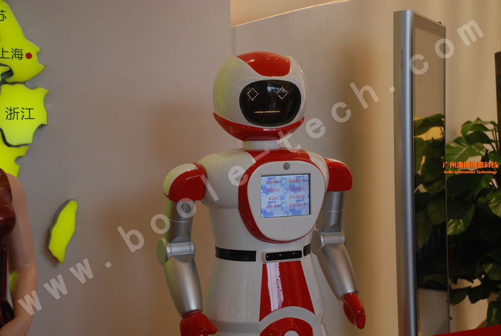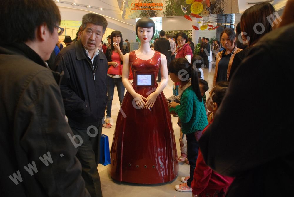 這是一款美女外形的迎賓機(jī)器人,曾經(jīng)上過中央電視臺CCTV10科技頻道,其胸前有一塊屏幕,能展示相應(yīng)的信息,機(jī)器人擁有語音識別功能,能夠與觀眾對話。機(jī)器人底部有多個(gè)傳感器,能自動避開障礙,并能按照預(yù)先設(shè)定的路線行走。