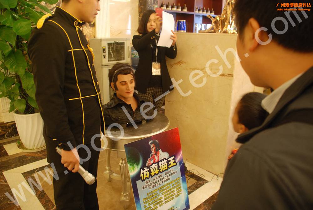 按照已故天王巨星“貓王”外表設計,1:1還原,無論是發(fā)型、臉型、皮膚,甚至是衣服也頗有當代歌星的特征!高仿真機器人“貓王”主要有兩大功能:唱歌,說話。通過遙控器控制,可讓機器人唱歌,期間機器人頭部會擺動,嘴巴會張合,甚至連眼睛、眉毛、嘴角等細節(jié)動作也能突顯出來!